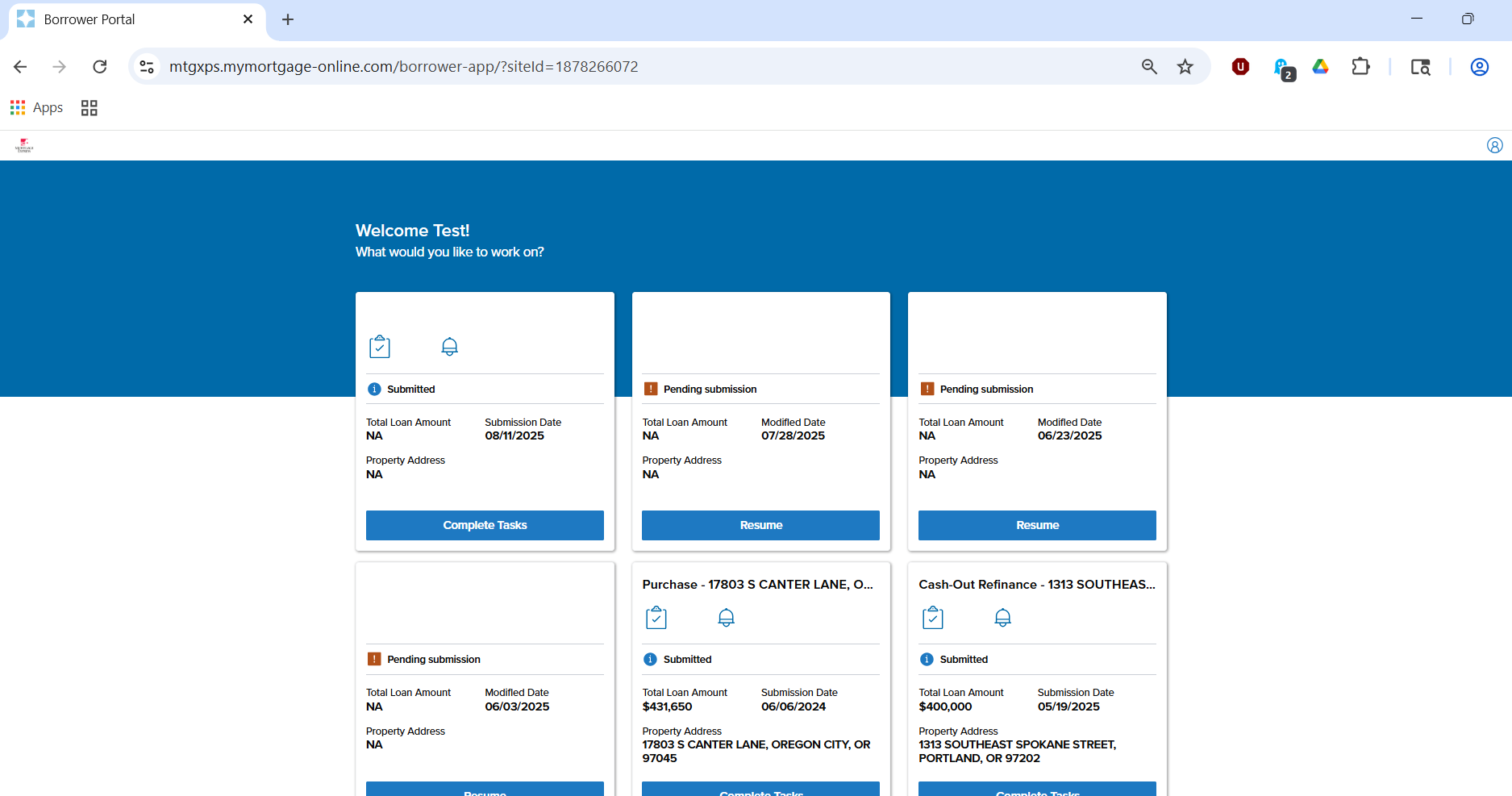 The screenshot on this page shows an example of what a user's Home Tab might look like in the Borrower Portal if that user had multiple loans and applications in process.